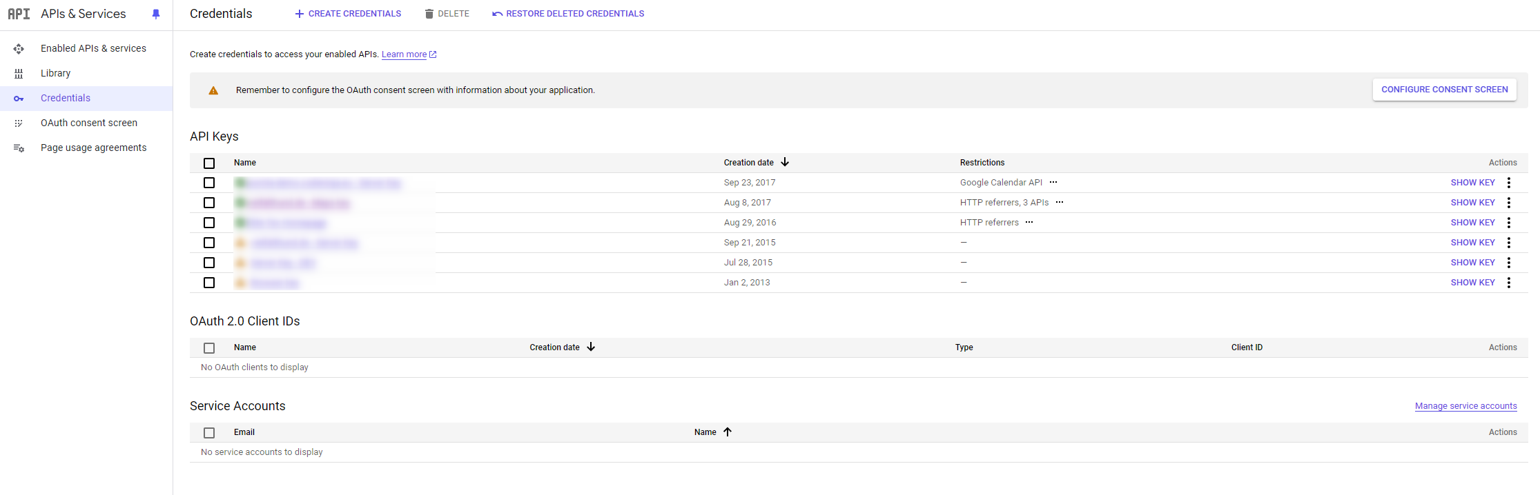 After you’ve added the “Google Calendar API” you also might need to add a new credentials (API-Key) to start using it. Please navigate to “Credentials” the navigation on the left side you should than find an overview of your authentication methods there.