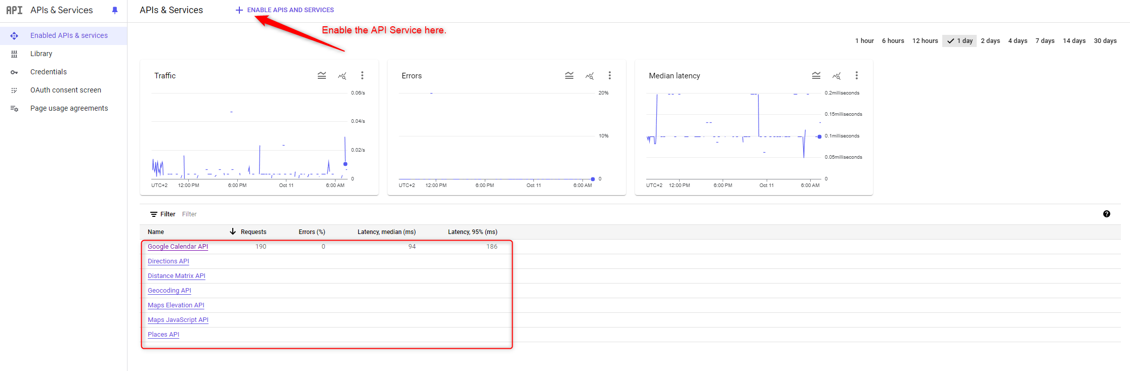 To enabled a new API for the account please click on “Enabled Apis and Services” you could than search for “Google Calendar API” and add it to the list of enabled APIs.